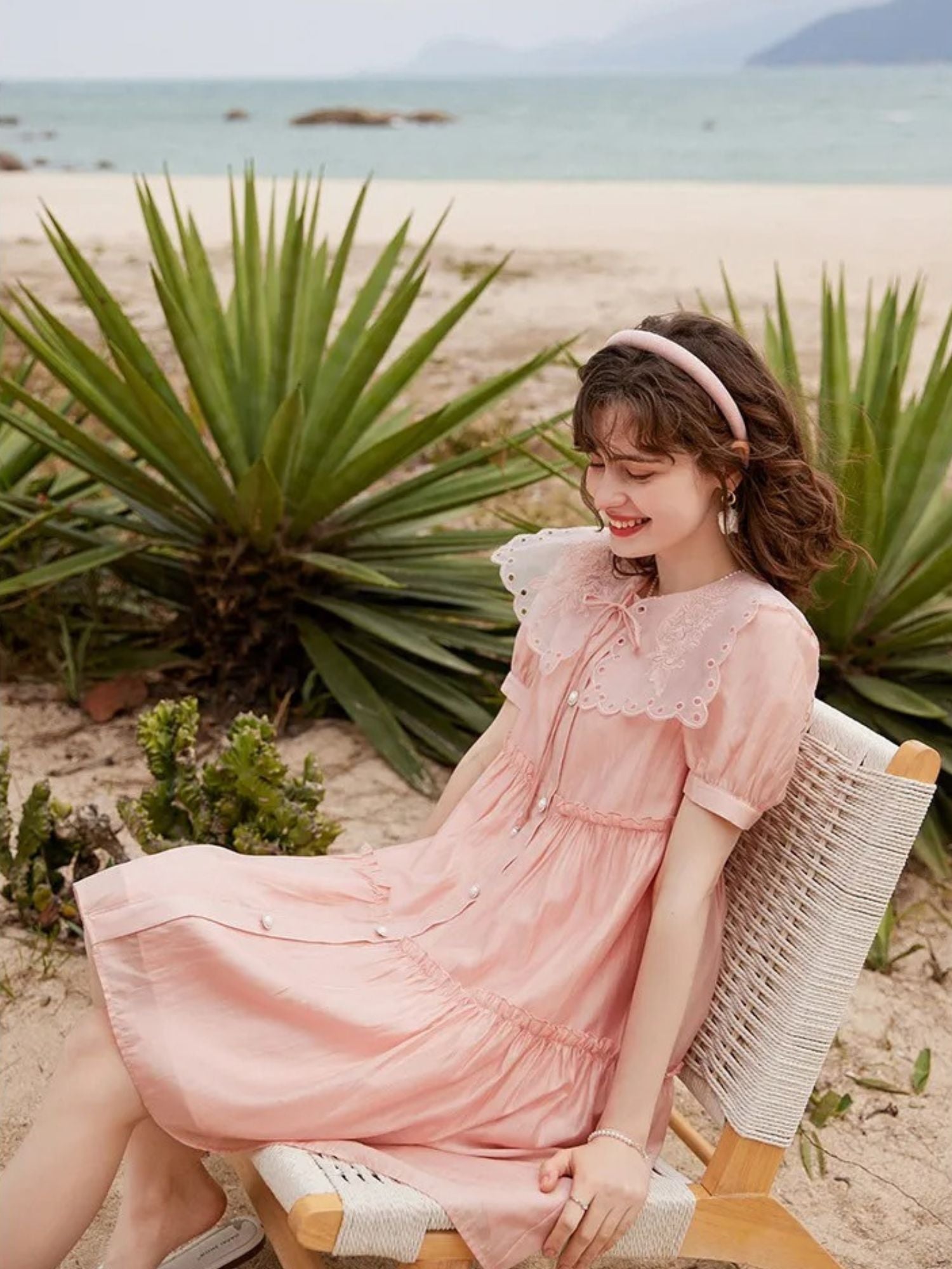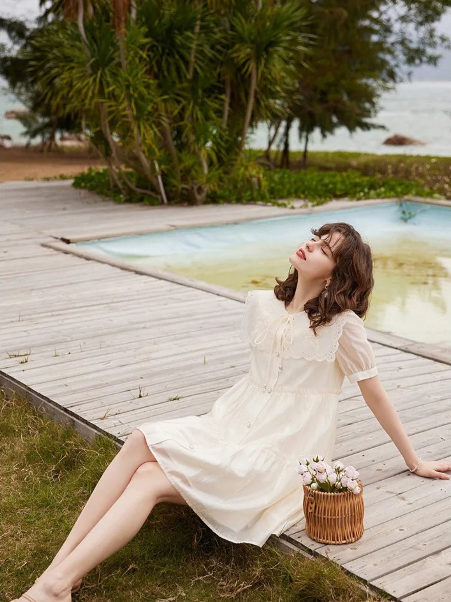 Urocza sukienka mini wyróżnia się delikatnym kołnierzykiem Piotrusia Pana z wycięciami, które nadają jej nutę vintage. Rozkloszowany, luźny krój zapewnia komfort przez cały dzień, a zapięcie na guziki z przodu dodaje kobiecego i eleganckiego charakteru.